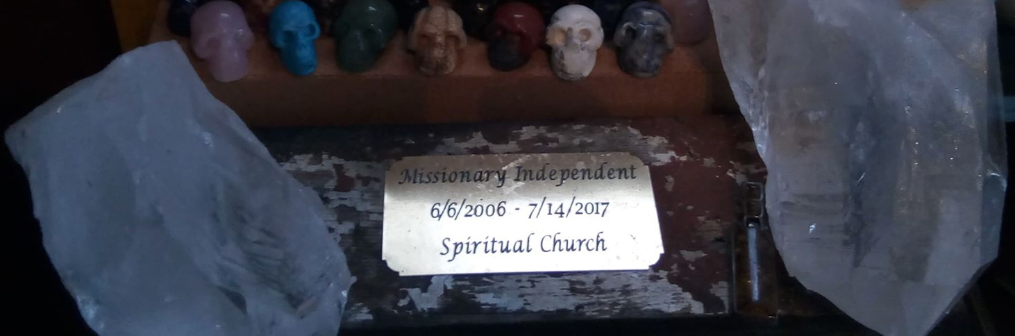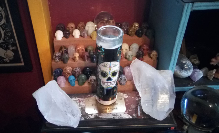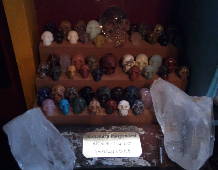 The Altar of 50 Skulls is a section of Divine Harmony Spiritual Church that is devoted solely to Headwork. Headwork is a powerful form of hoodoo that can be used to make the target think or dream about someone or something, to insert subliminal messages in one's head, to make the target believe or deny certain thoughts, or to uncross and heal the mind of anyone suffering from emotional agony, dark dreams, love spells, or any form of mind control. The skulls represent ancestors who will be called forth to intercede on the caster's behalf. Adding power to the altar is a timber from the original Missionary Independent Spiritual Church. Two large quartz crystals amplify the energies even more - making ceremonies done on this altar particularly powerful!