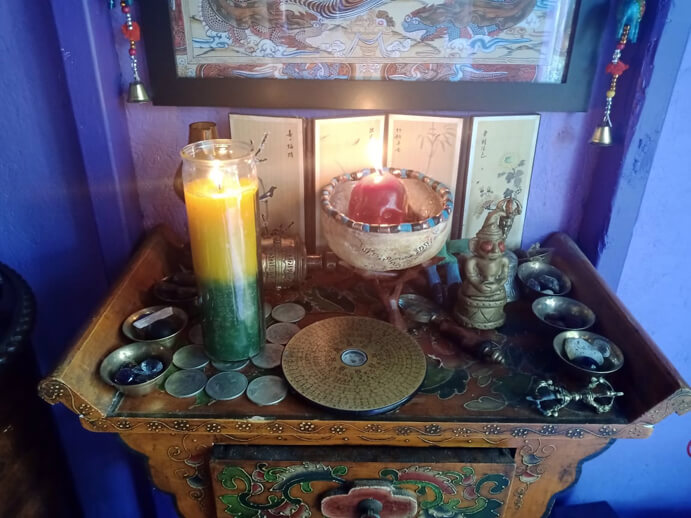The Shrine of the Compassionate Bodhisattvas is a dedicated altar to call upon Buddhist Saints for help with all manner of situations. The shrine is composed of several relics, including a prayer wheel, a kapala which is a holy relic from Tibet made from the brainpan of a human skull, a bell & dorje from Tibet, seven Tibetan offering bowls, a Phra Ngang statue which, according to legend, was blown out of a temple during a time of war, stained with the blood of fallen soldiers, and is possessed by mountain spirits.