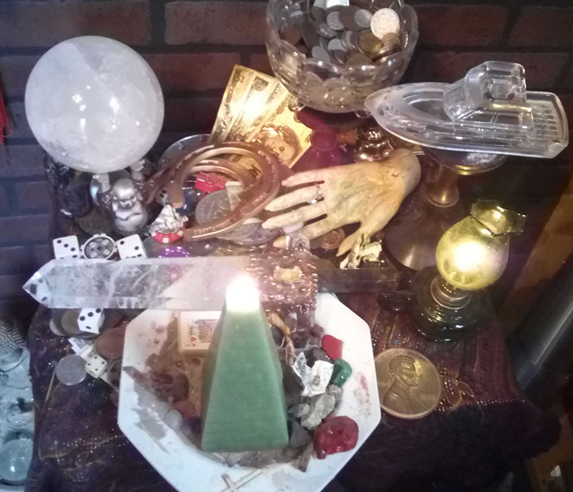 The Altar of Infinite Prosperity is a section of Divine Harmony Spiritual Church that is devoted solely to ceremonial money and prosperity work. Having ceremonial work performed on this altar is believed to provide reassurance that the bills will be paid, good luck is with the target, one will be able to meet their own needs, and that the needs of family and loved ones are met. Coins, paper money, gambling chips and other symbols of wealth adorn the altar along with symbols of luck, money charms, and talismans personally constructed by Reverend Saint Germain. A green pyramid candle, dressed with the appropriate prosperity and attraction oils, is burned. Large quartz crystals amplify the power of the altar even further, making work done on this shrine particularly potent!