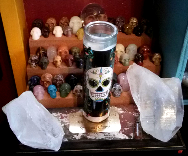 The Altar of 50 Skulls is a section of Divine Harmony Spiritual Church that is devoted solely to Headwork. Headwork is a powerful form of hoodoo that can be used to make the target think or dream about someone or something, to insert subliminal messages in one's head, to make the target believe or deny certain thoughts, or to uncross and heal the mind of anyone suffering from emotional agony, dark dreams, love spells, or any form of mind control. The skulls represent ancestors who will be called forth to intercede on the caster's behalf. Adding power to the altar is a timber from the original Missionary Independent Spiritual Church. Two large quartz crystals amplify the energies even more - making ceremonies done on this altar particularly powerful!