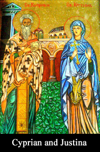 He eventually moved to Antioch where he became known for his philosophical musings and as a powerful sorcerer. As the legend goes, one day a young man named Aglaidas came to seek his services as a conjurer, to win the love of a beautiful Christian virgin named Justina. Cyprian worked his magic, but was unsuccessful in turning her will. Justina’s faith in god was resolute, and through her diligent prayers she was immune to Cyprus' works. Cyprian continued his attempts, even resorting to setting demons loose on Justina, but all of these efforts were also exhausted without result. Some versions of the tale say that upon seeing this, Satan himself became angry and tried to carry out the assignment, but after Justina made the sign of the cross, his efforts were also in vain. These events, along with her eventual martyrdom, have given cause for Justina to be venerated in many churches.