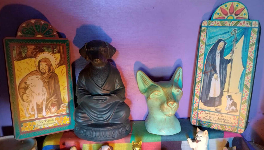 The Divine Harmony Pet Shrine is an altar at Divine Harmony Spiritual Church that is devoted to calling upon Saint Gertrude, the patron saint of cats, Saint Rocco, the patron saint of dogs, and Julian of Norwich, to watch over, protect, and heal our animal friends or animal lovers who are facing difficulties.