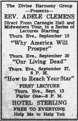 Rev. Clemens was a prolific speaker and gave many lectures on metaphysical topics along with evangelical tours all across the country. She was the author of several books and pamphlets, among them a book on church candle services she co-authored with Mikhael Strabo, and a one-sheet entitled Following in His Footsteps. Reverend Clemens was a true pioneer in the spiritual church movement and her published methods on candlelight services are still influential today.