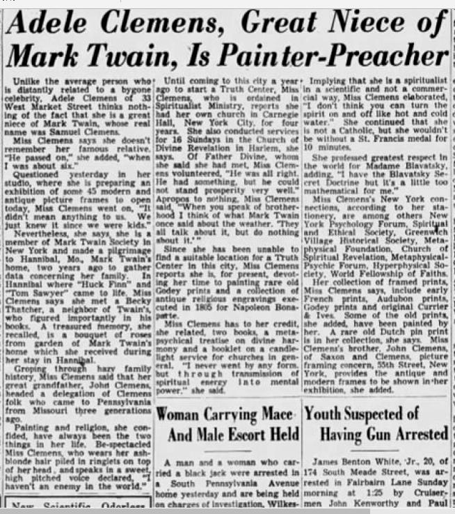 Later in life she gained further notoriety for her artwork which was exhibited all over the country. Despite having no formal training, she is credited with inventing new techniques in coloring, and her work garnered acclaim nationwide. Her brother John Clemens was a founding member of the Saxon & Clemens Art Gallery in New York City to which she made numerous contributions. She organized and led the Studio Artists Group in Wilkes-Barre for many years which offered instruction and guidance for aspiring artists, and she taught arts & crafts classes at the YWCA in Pittston, PA. Ms. Clemens exhibited her collection of antique frames and art in her own studio in Wilkes-Barre, where she also continued to hold private consultations.